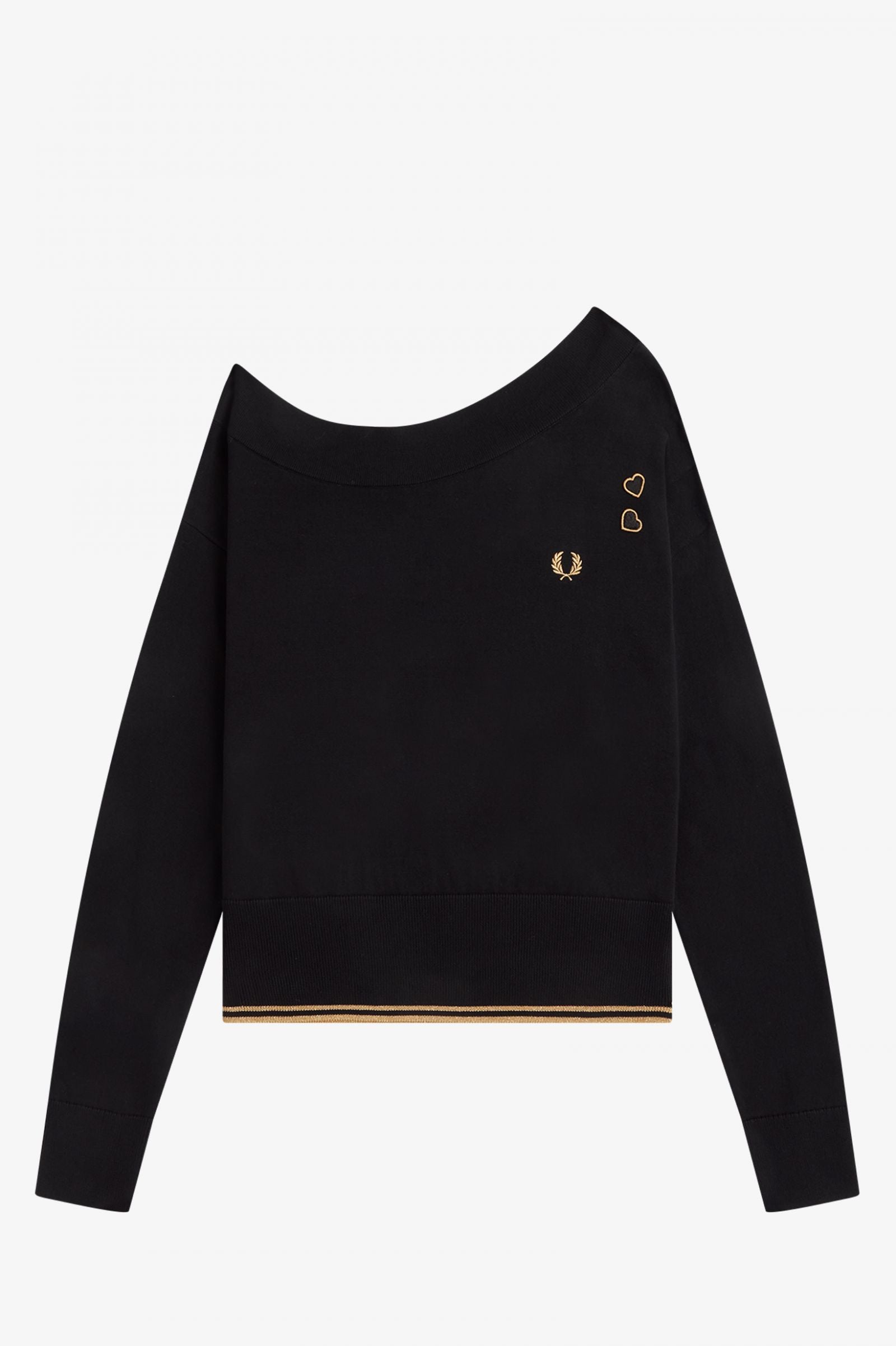 Our Amy Winehouse inspired top is crafted from a cotton jersey knit for a classic look. An off-the-shoulder design with ribbed neck, hem, and cuffs alludes to the singer's signature style. An embroidered patch of love hearts above the Laurel Wreath top off the subtle homage to Amy's work.