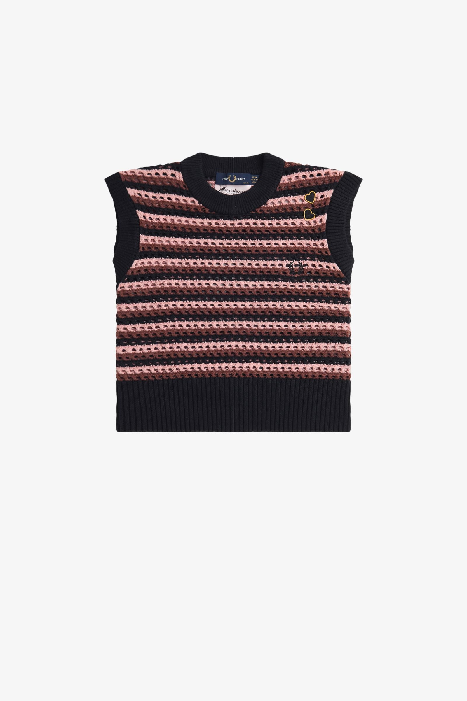 This Amy Winehouse Open-Knit Tank is crafted from crochet-style knitted cotton and draws inspiration from her holiday wardrobe. Made with cotton knit, it has a regular fit and features a crew neck, ribbed hem and cuffs, and an embroidered Laurel Wreath on the left chest with Amy's signature heart patches above.