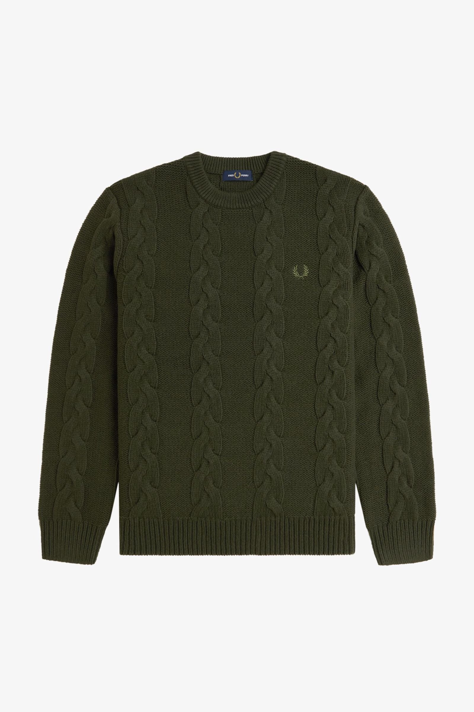 Level up your sweater game with the Fred Perry Cable Knit Jumper in Hunter Green. Stay cozy and stylish with this iconic piece that will have you looking effortlessly cool all season long. Time to make your friends green with envy (and your pockets happy with this great deal)!