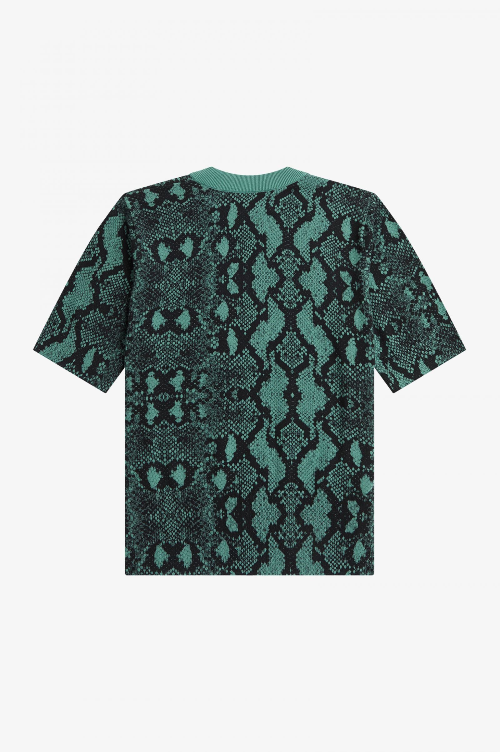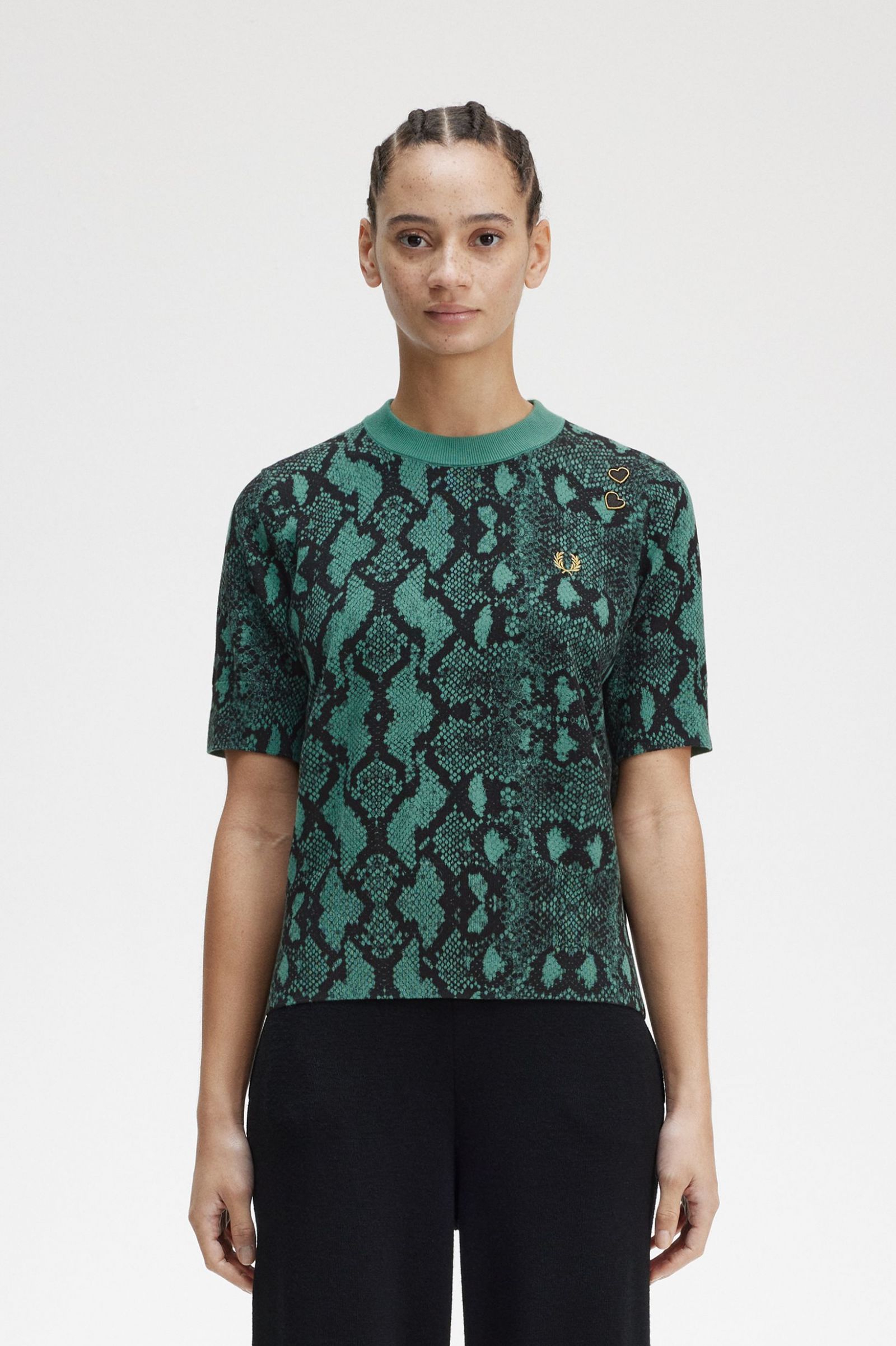 A jumper crafted with a fine gauge jersey knit fabric, regular fit, and ribbed trims on the cuffs and hem. Featuring an eye-catching all-over snake print with Amy embroidered heart patches above the Laurel Wreath. This piece is inspired by the modern colour schemes and animal prints of Amy's early 2010 style.