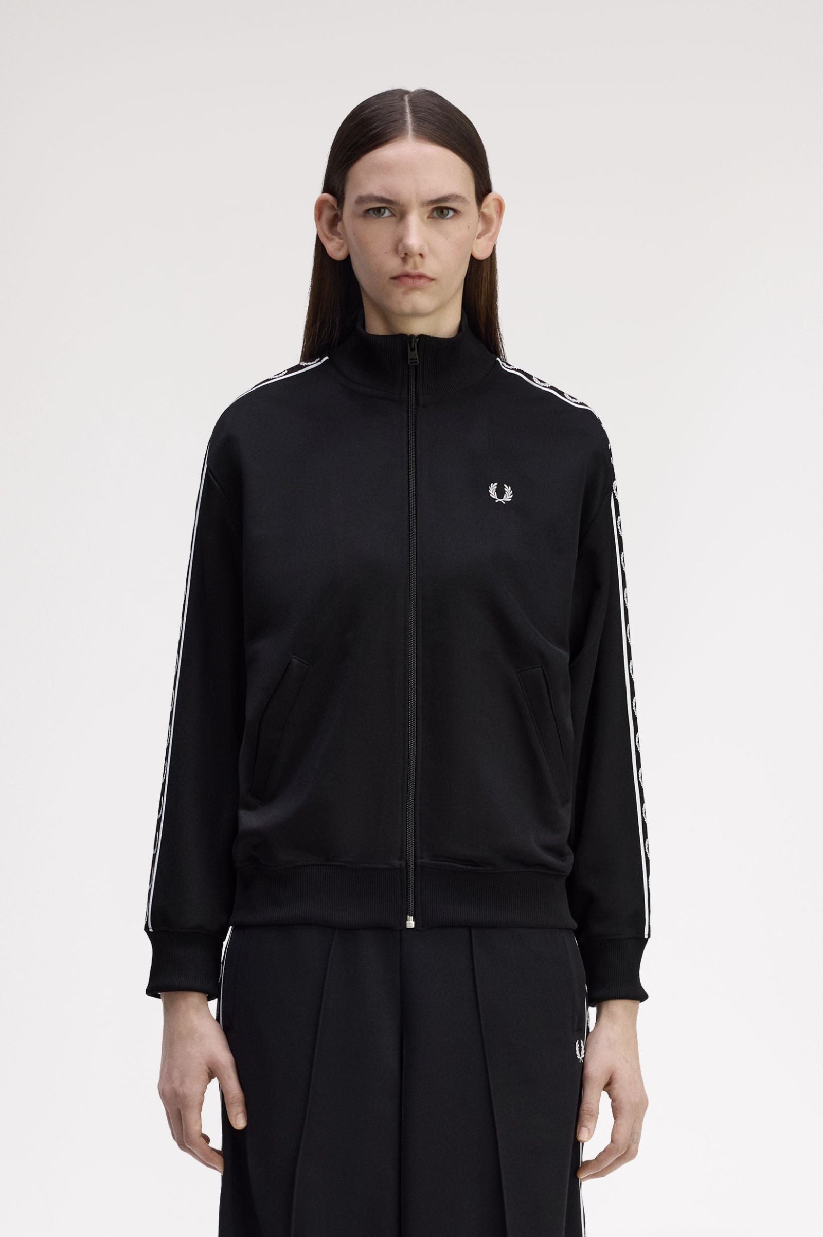 Elevate your off-duty rotation with our Taped Track Jacket—a playful take on vintage sportswear. Crafted from recycled polyester and cotton tricot, this relaxed-fit layer features bold monochrome contrast and signature sports taping across the arms and shoulders. The lowered armhole ensures effortless movement, while functional welt pockets and a smooth coil zip with branded puller keep things practical. Finished with an embroidered Laurel Wreath logo on the chest—a subtle nod to athletic heritage.