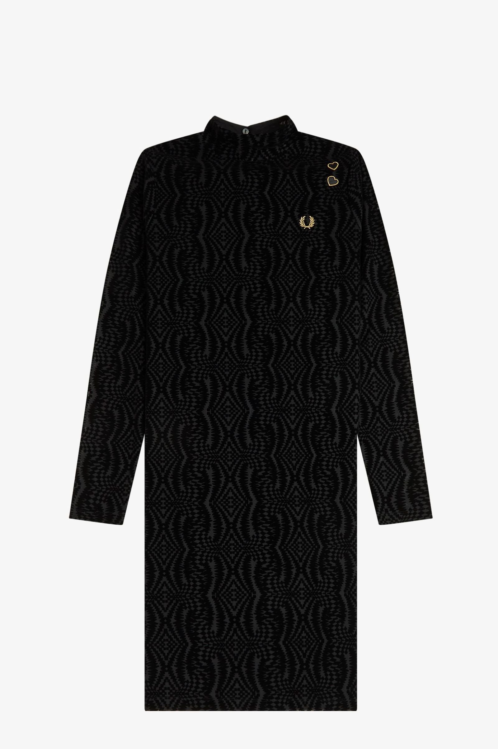 Dive into effortless elegance with our Flock Print Mesh Dress—a playful take on sustainable style. Crafted from fully recycled polyester, this mesh beauty features a mesmerizing dark and stormy optical wave flock print that catches the light beautifully. The regular fit flatters every frame, while the cheeky keyhole button opening at the back neck adds an unexpected twist. Topped with embroidered Laurel Wreath and Amy's loveheart patches on the left chest, it's the perfect blend of whimsy and sophistication. Feel good looking good.