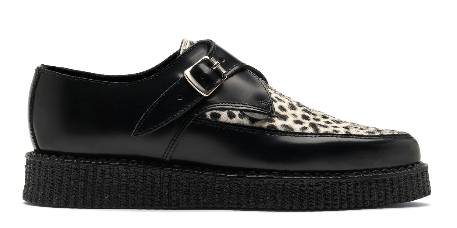 The Apollo Creeper – Black Leather & Leopard Print is a monk creeper interlace shoe, constructed on a walled, pointed-toe last and has a buckle fastening.
