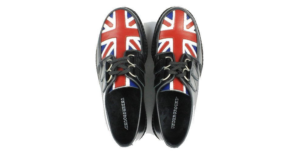 Unleash your edgy, unique style with the Underground Wulfrun Union Jack! These Allgender shoes feature a walled round-toe last for comfort, trendy D-ring lace design with keepers, and a bound edge apron for added flair. Get ready to turn heads and make a statement with these original Wulfrun Creepers.