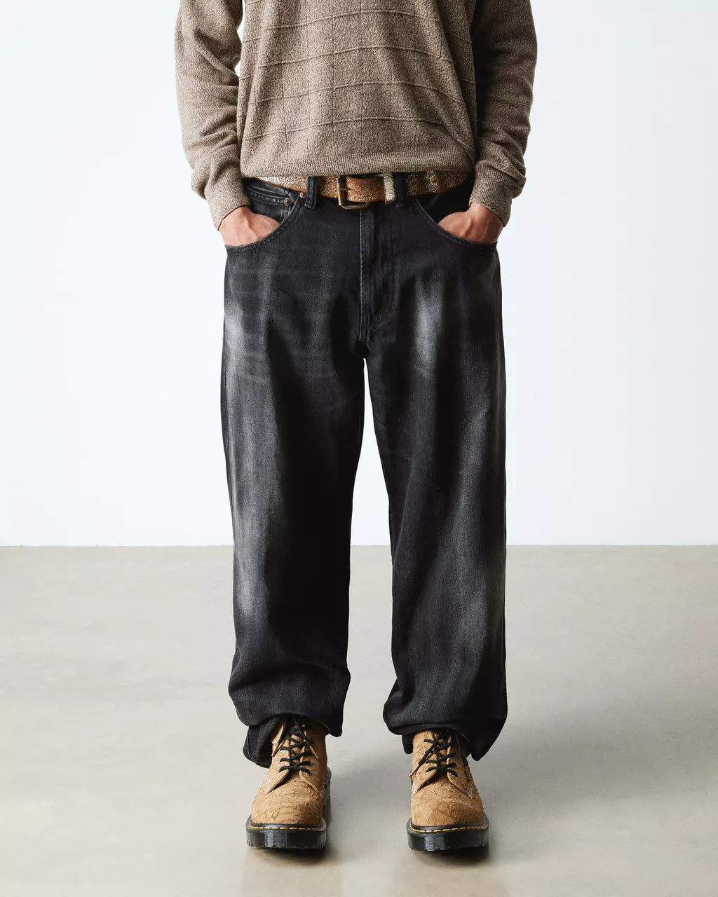 The 1460 Made in England boot elevates our iconic silhouette with magnified craftsmanship. A pronounced bump toe creates an exaggerated profile and unmistakable edge, while C. F. Stead's Heavy Emboss Hairy Suede delivers distinctive character and texture. Woven laces, antique brass hardware, and a removable swing tag complete the refined details. The heightened Bex sole features deep cleats for grip and presence, secured with signature yellow stitching. Black and gold heel loop branding finishes this statement-making boot.