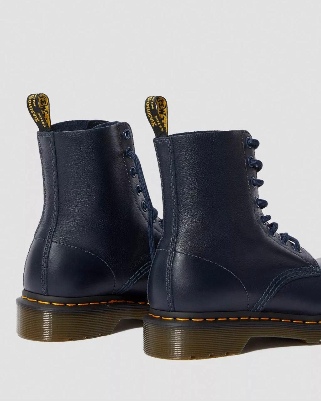 New colors for 1460 PASCAL DRESS BLUE boots! Made with grained Virginia leather, featuring iconic yellow stitching and air-cushioned sole. Constructed with Goodyear welt and a sleeker footbed shape.