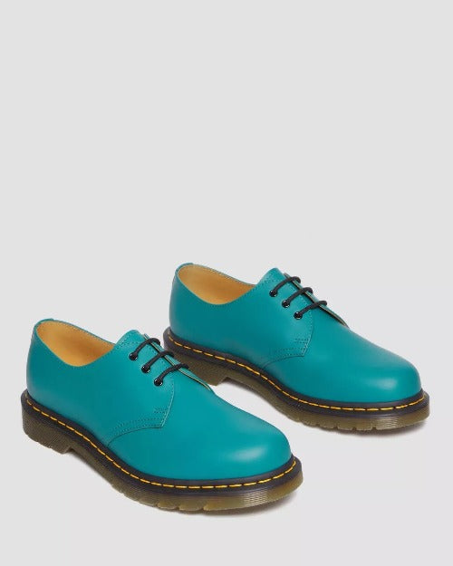 1461 Smooth Teal Green 3 eye shoe is a necessity for stylish rebels and trendsetters. Equipped with legendary Docs DNA, grooved edges, yellow stitching and the ultra-durable Smooth leather, you'll look and feel like a total iconoclast. Plus, Goodyear welt construction ensures it'll last a lifetime! Our Airwairs original signature leather strikes the perfect balance between wearability and eye-catching sheen. Just wipe it down with a damp cloth and you're good to go! Dr. Martens' US sizes offer the perfect fit with just a bit of extra room for breathability. UK size also noted on shoe. Get ready for a wild ride in Teal Green!