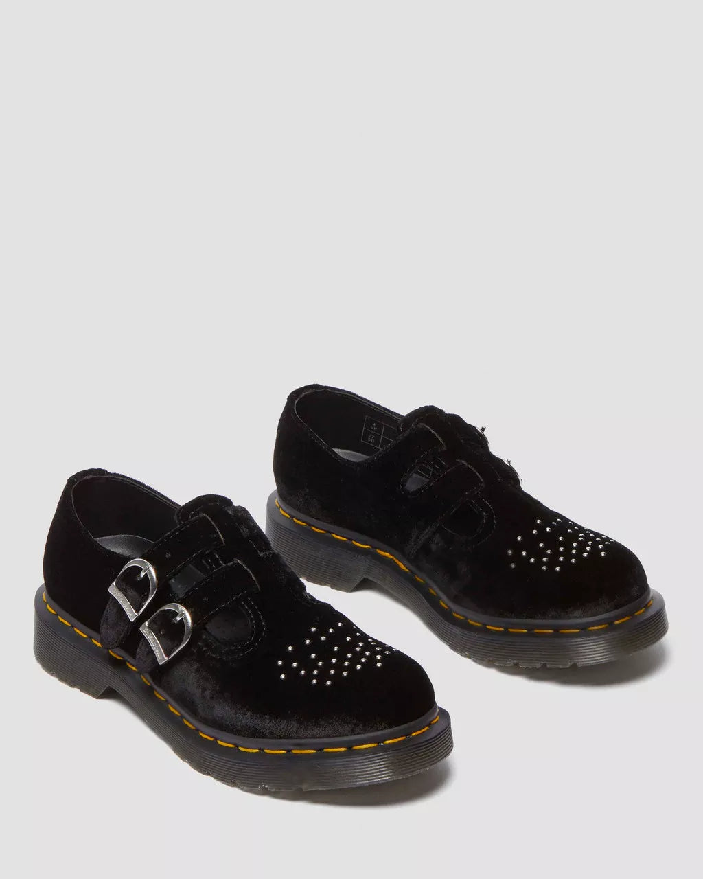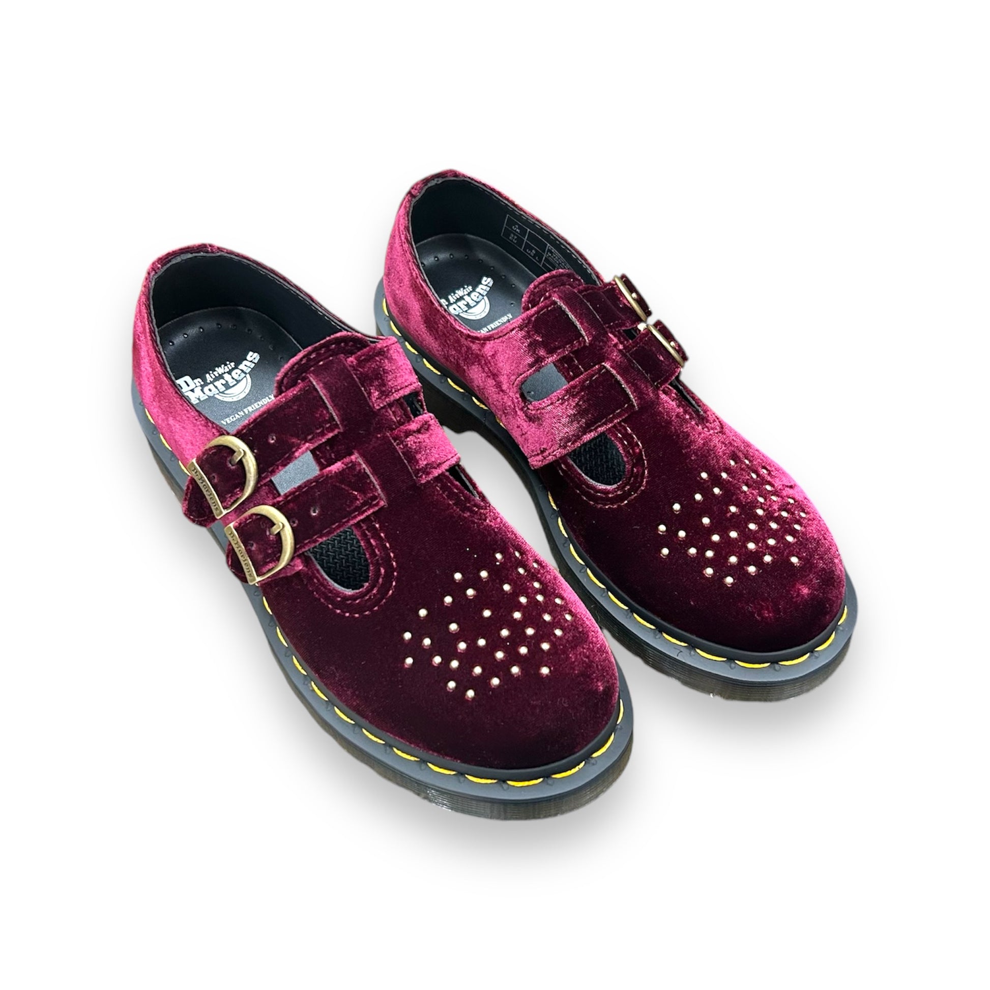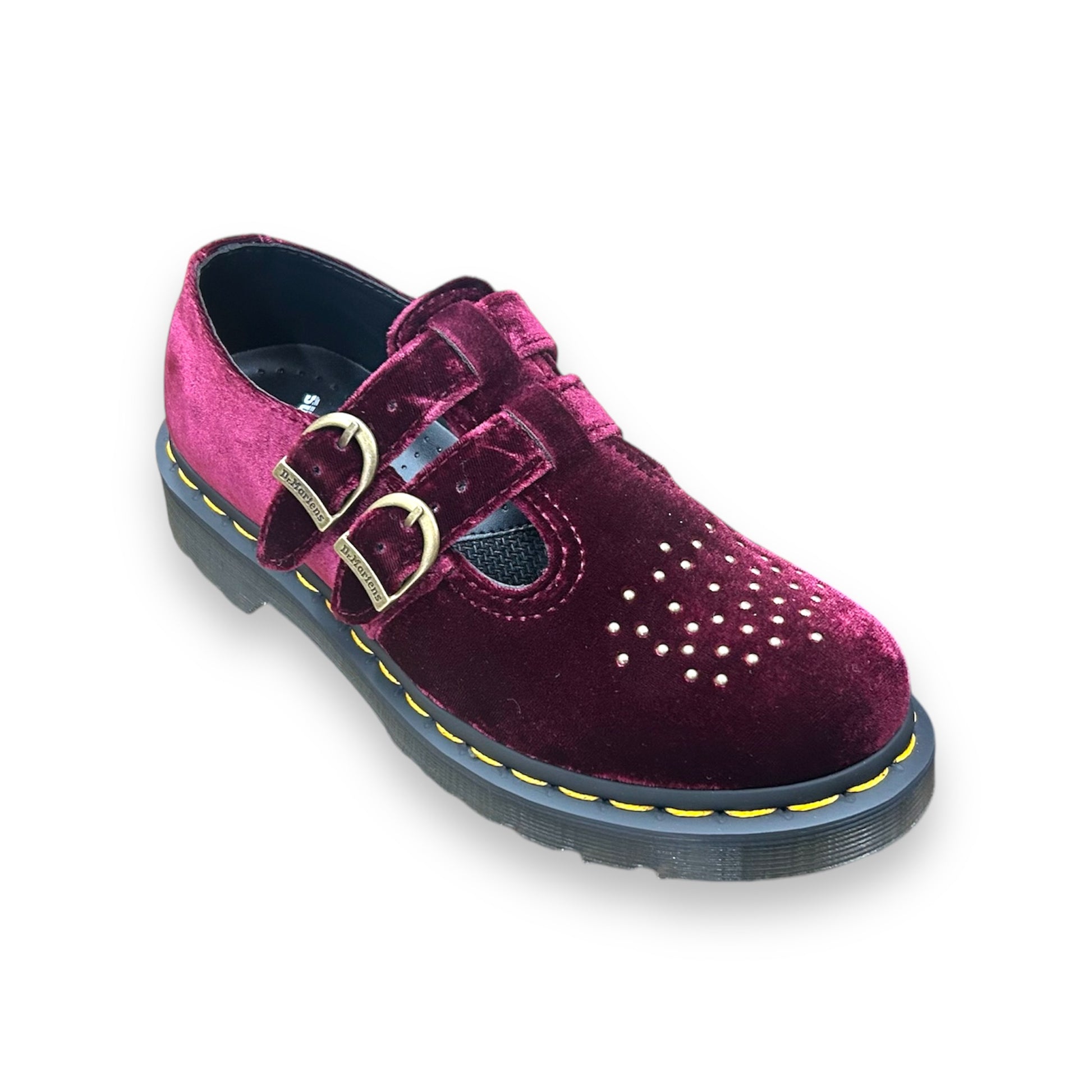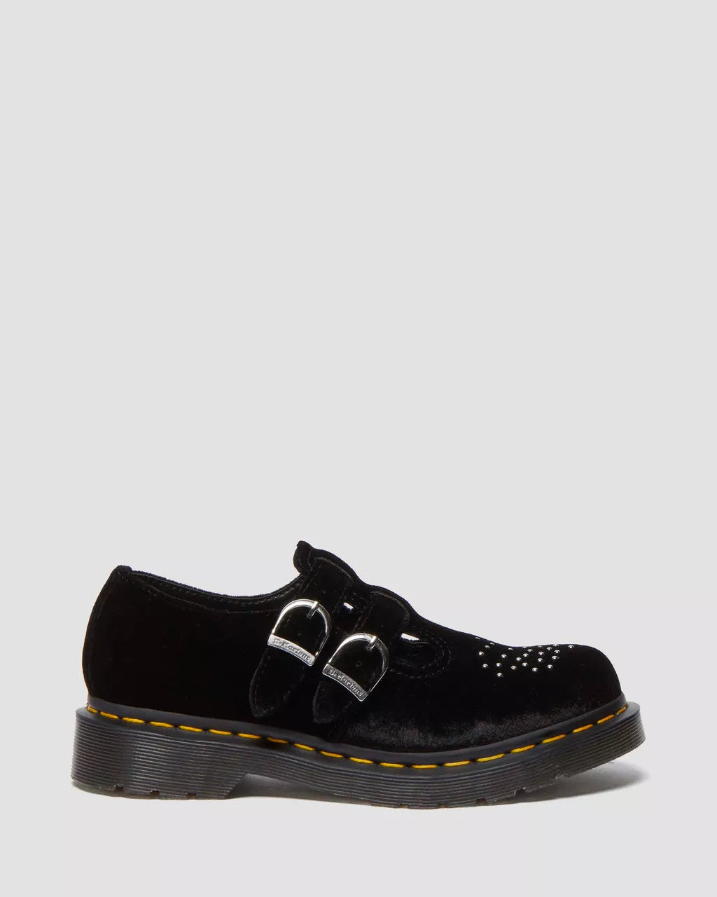 Introducing our 8065 Vegan Velvet Mary Jane Shoes - a classic shoe with a grunge twist! Made with vegan-friendly velvet and brogue-style studs, it features 2 adjustable branded buckles and a grooved DMS sole with yellow welt stitching. Soft, strong, and stylish - a perfect addition to your wardrobe.