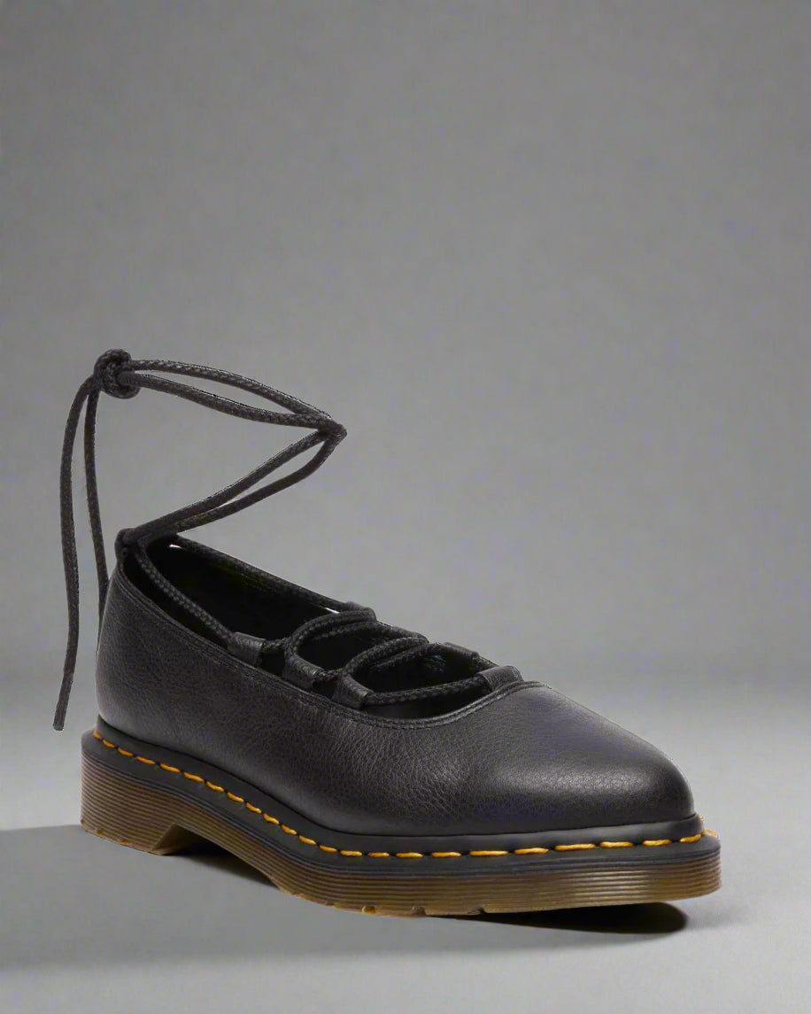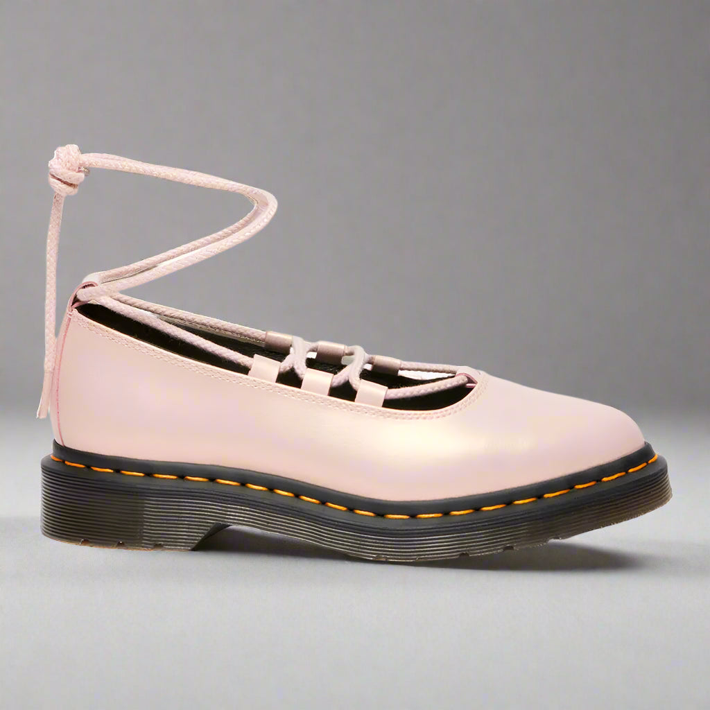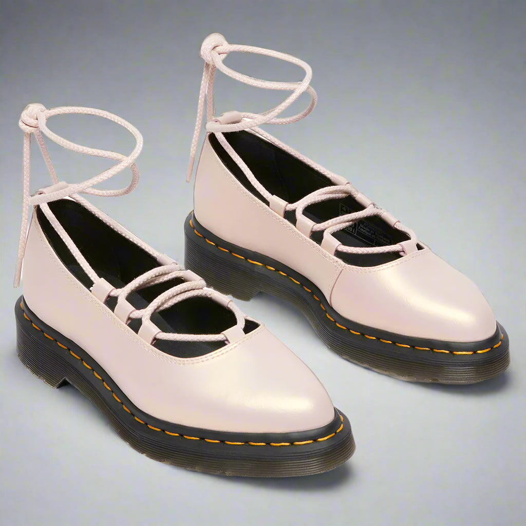 Introducing Elphie II - the ultimate twist on a classic ballet flat. Made from powder pink Shift leather with an iridescent finish, these shoes are both unique and versatile. The customisable wraparound laces and signature DM's grooving pattern add a touch of playfulness to your look. (Less dainty, more Doc's!)