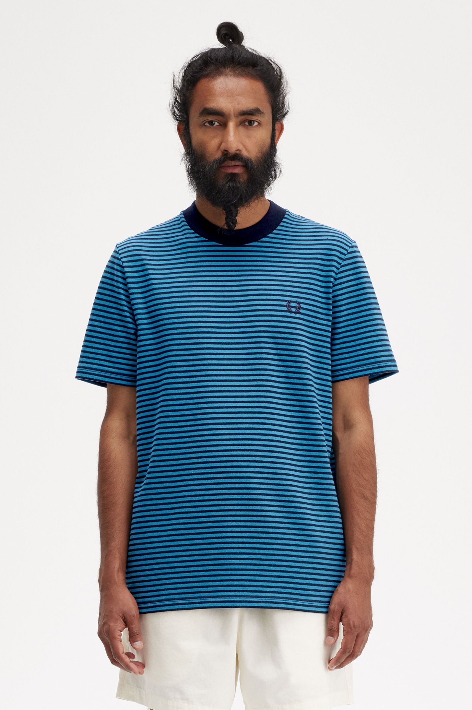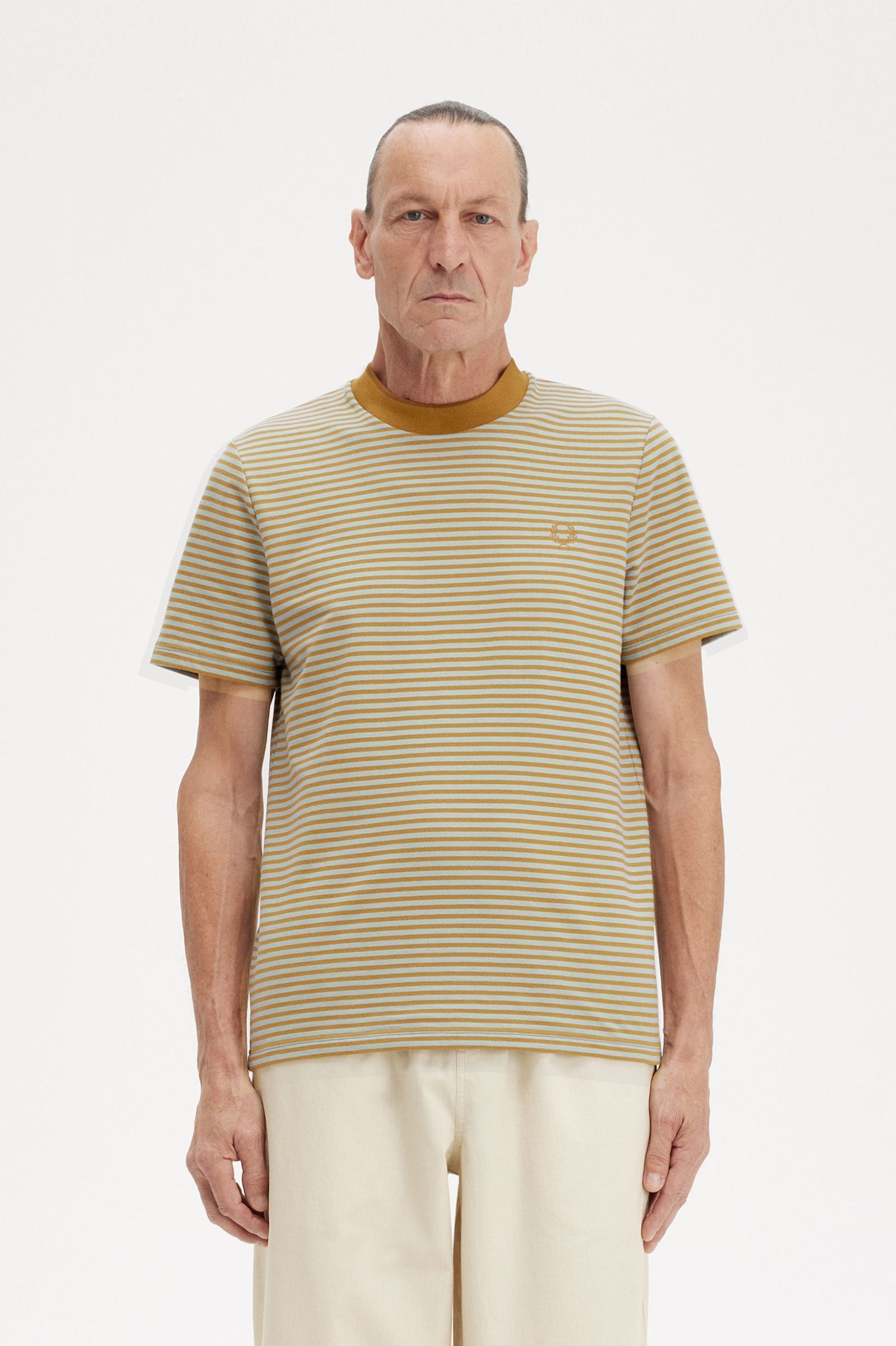Fred Perry Hefty jersey cotton t-shirt with slim yarn-dyed stripes. Durable jersey cotton fabric / Streamlined fit / Yarn-dyed stripe pattern / Laurel Wreath embroidered logo on left chest