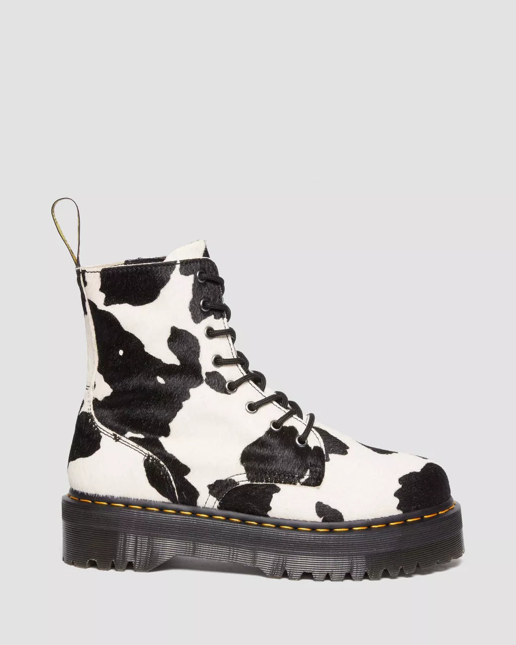 Don't fade into the background. Show off your style with this standout version of the Jadon boot, made of statement-making Cow Print Hair On leather. Featuring our signature Quad sole with grooved detailing and yellow welt stitch, plus black laces, an inside zip, and a black-and-yellow heel loop. The Jadon boot upgrades the 8-eye boot to a whole new level. Look more statuesque and feel more daring - Hair On is an all-natural printed material made with real hair and leather. Plus, it stands higher with a chunky commando tread built to embolden. For everyone who's not scared of towering over the pack. Note: due to the natural material, colors and patterns may vary. Quality engineering - featuring Goodyear-welted lines sealed at 700˚C and reinforced with a signature welt stitch. Sole heights: Platform - 1 1/2 in; Heel - 2 in. Slimmer, tapered
