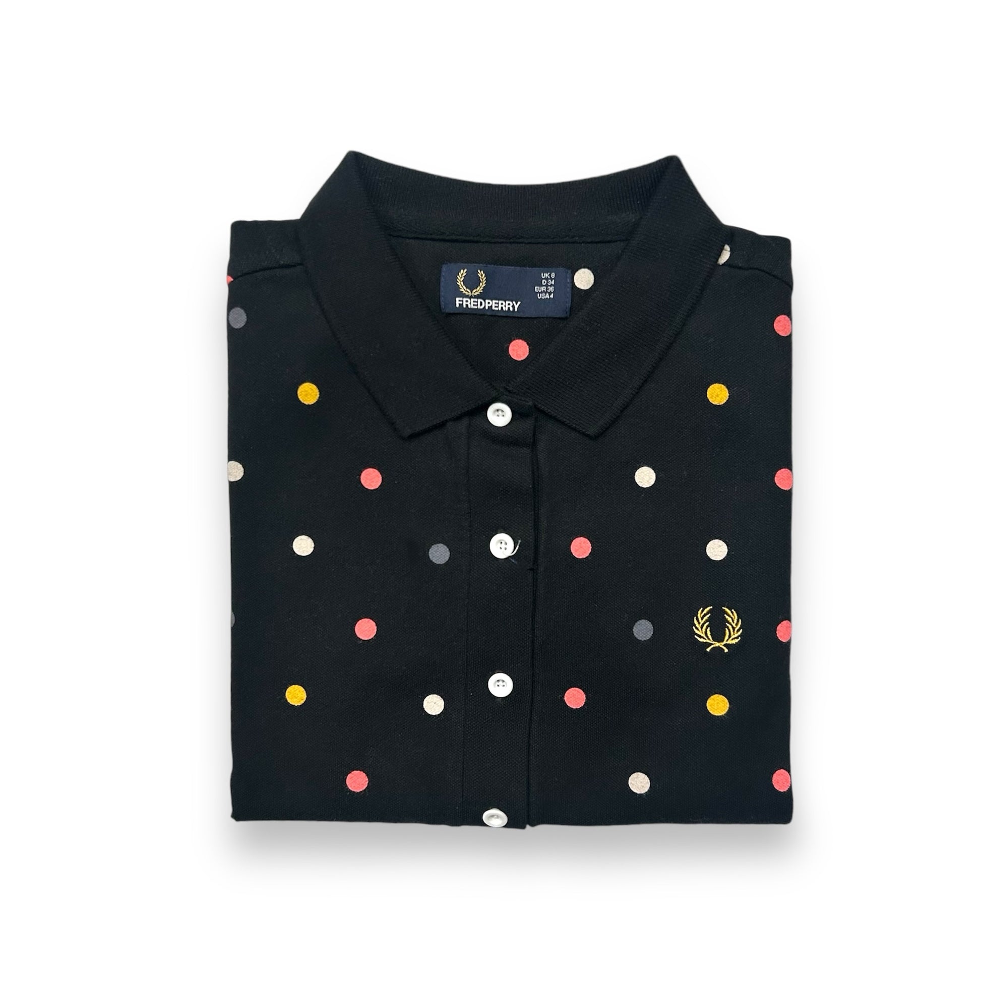 Add a playful touch to your wardrobe with this Ladies Fred Perry Multi Dot Print Shirt in chic black. Featuring a unique multi-dot print, this shirt exudes a quirky and fun vibe. Perfect for those who want to stand out from the crowd and make a statement with their style. Available now. (Only a few left!)