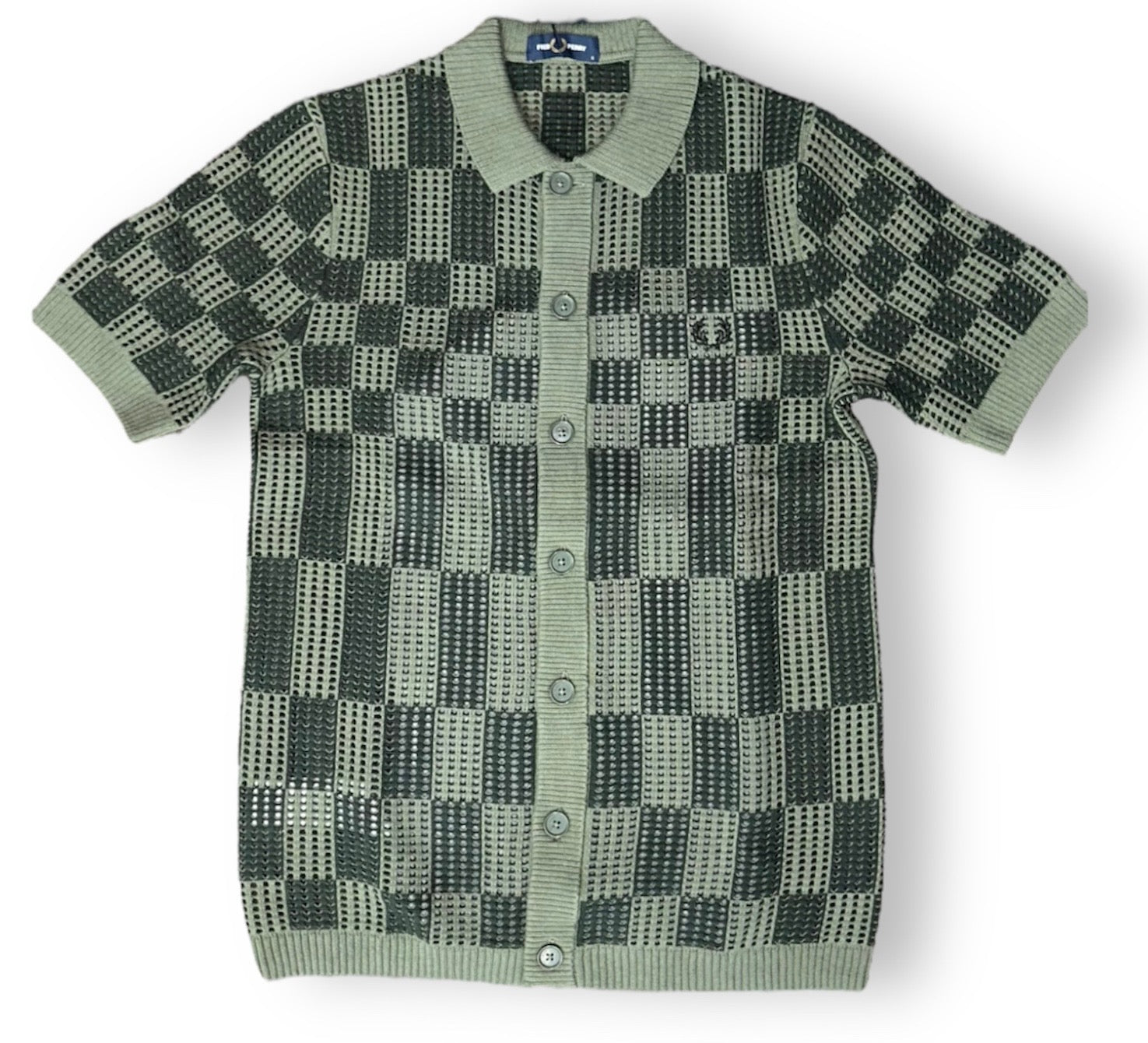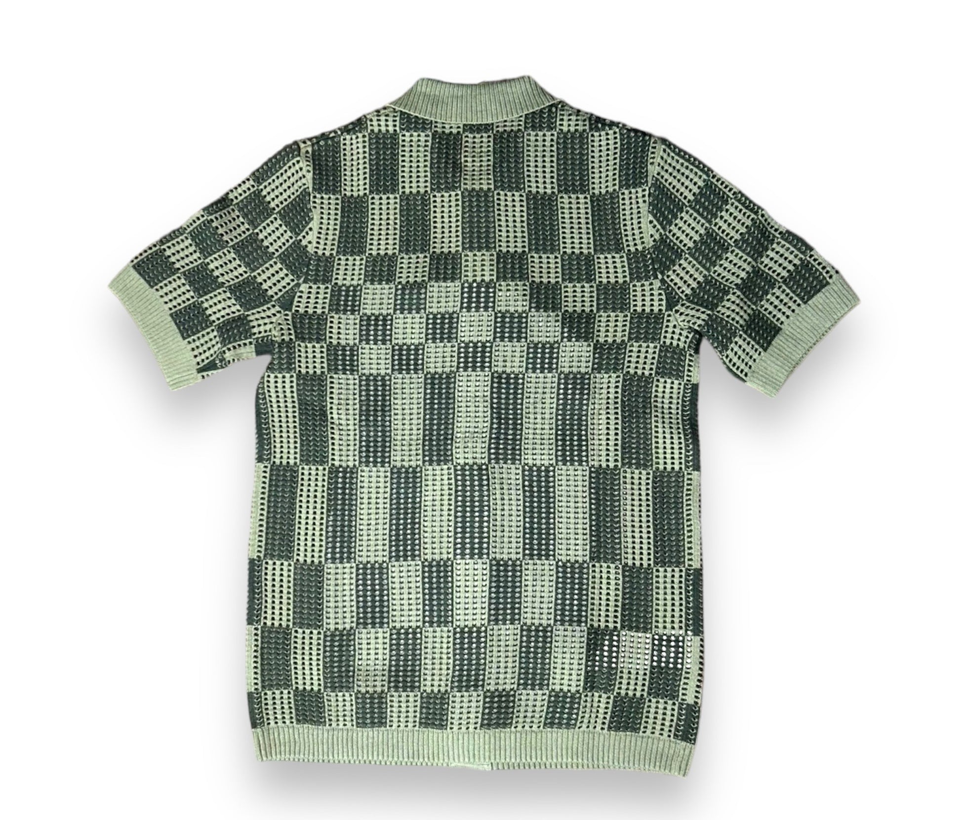 Introducing the Pointelle Chequerboard KTD Shirt! This quirky and fun shirt features a green chequerboard pattern and pointelle detailing. It's a playful addition to any wardrobe with its unique design and comfortable fit. Channel your inner fashionista with this one-of-a-kind shirt!