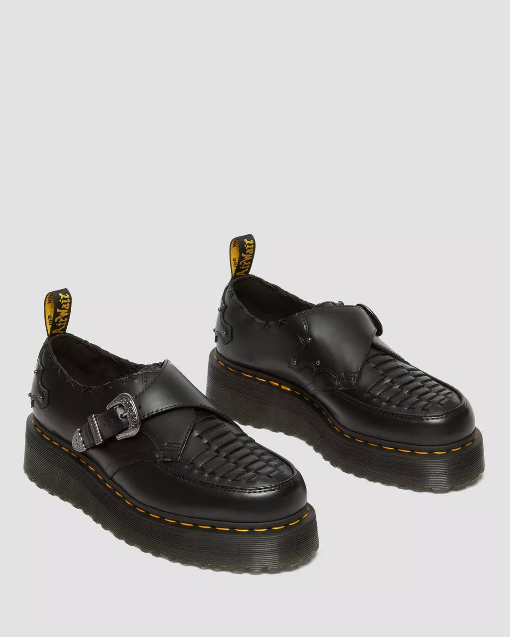 Upgrade your style with the Ramsey Woven Smooth Leather Platform Creepers. These updated creeper shoes feature a Quad wedge sole and traditional weave design for a rebellious yet fashionable look. Crafted with durable Smooth leather and adorned with a signature Monk strap and gunmetal stud decorations.